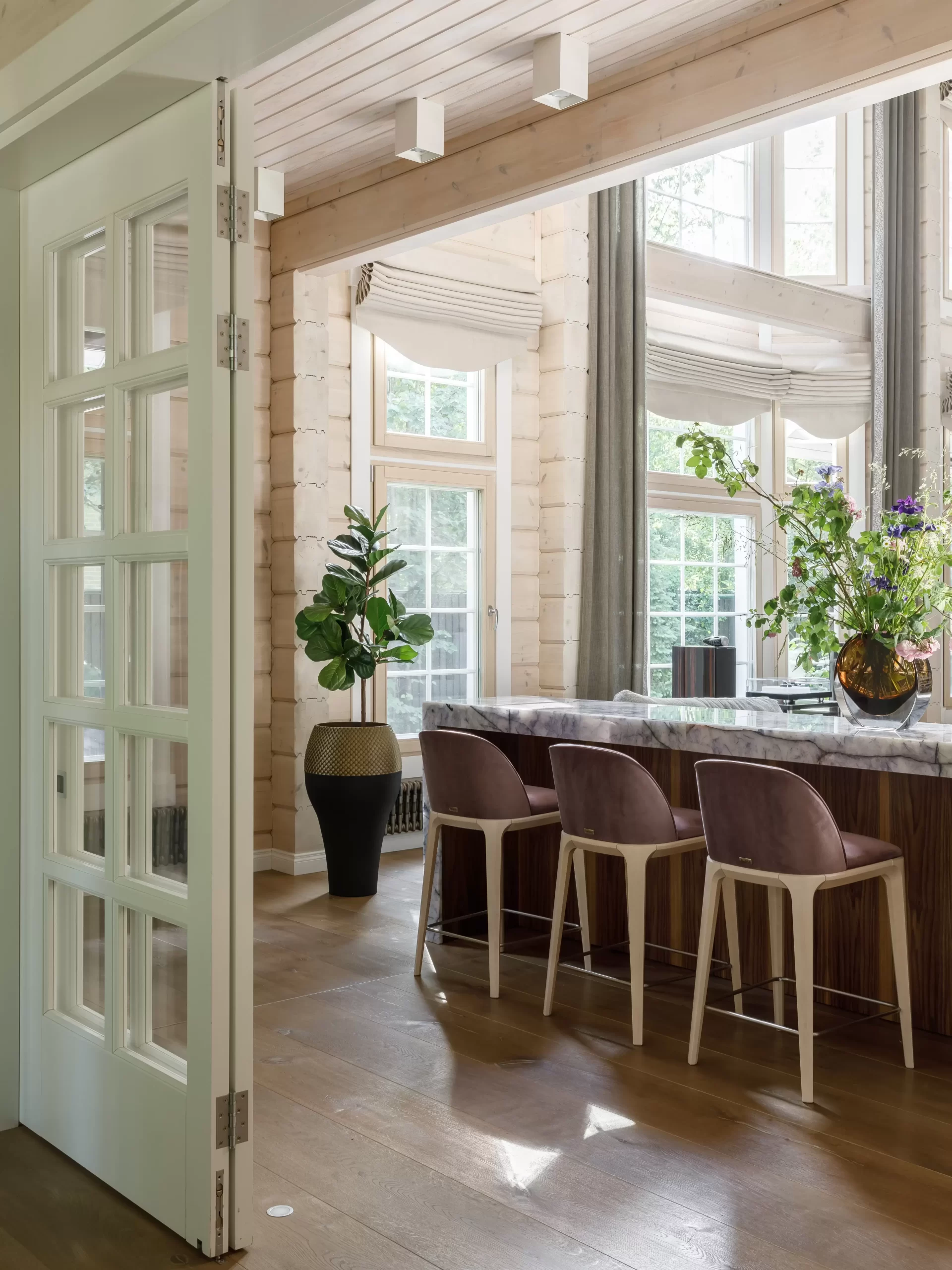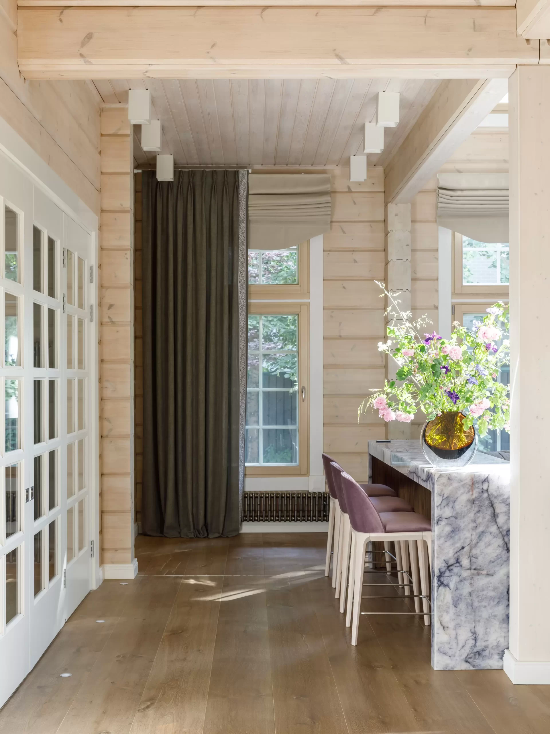 Диван Бруклин занимает достойное место в этой композиции. За диваном расположена кварцевая барная стойка. А за ней — полубарные стулья Play, удобные и устойчивые, в обивке из микровелюра и с выбеленными деревянными ножками.