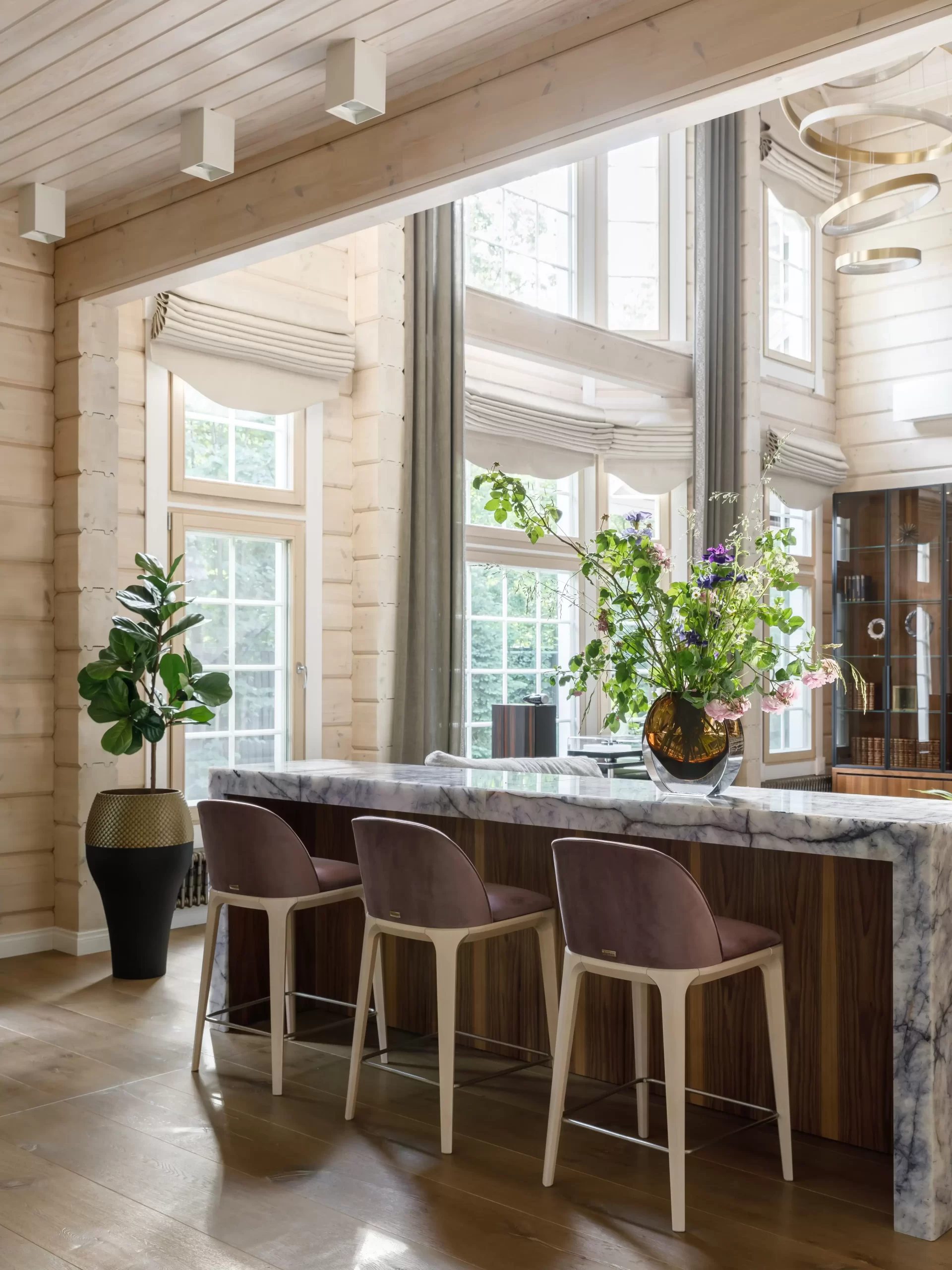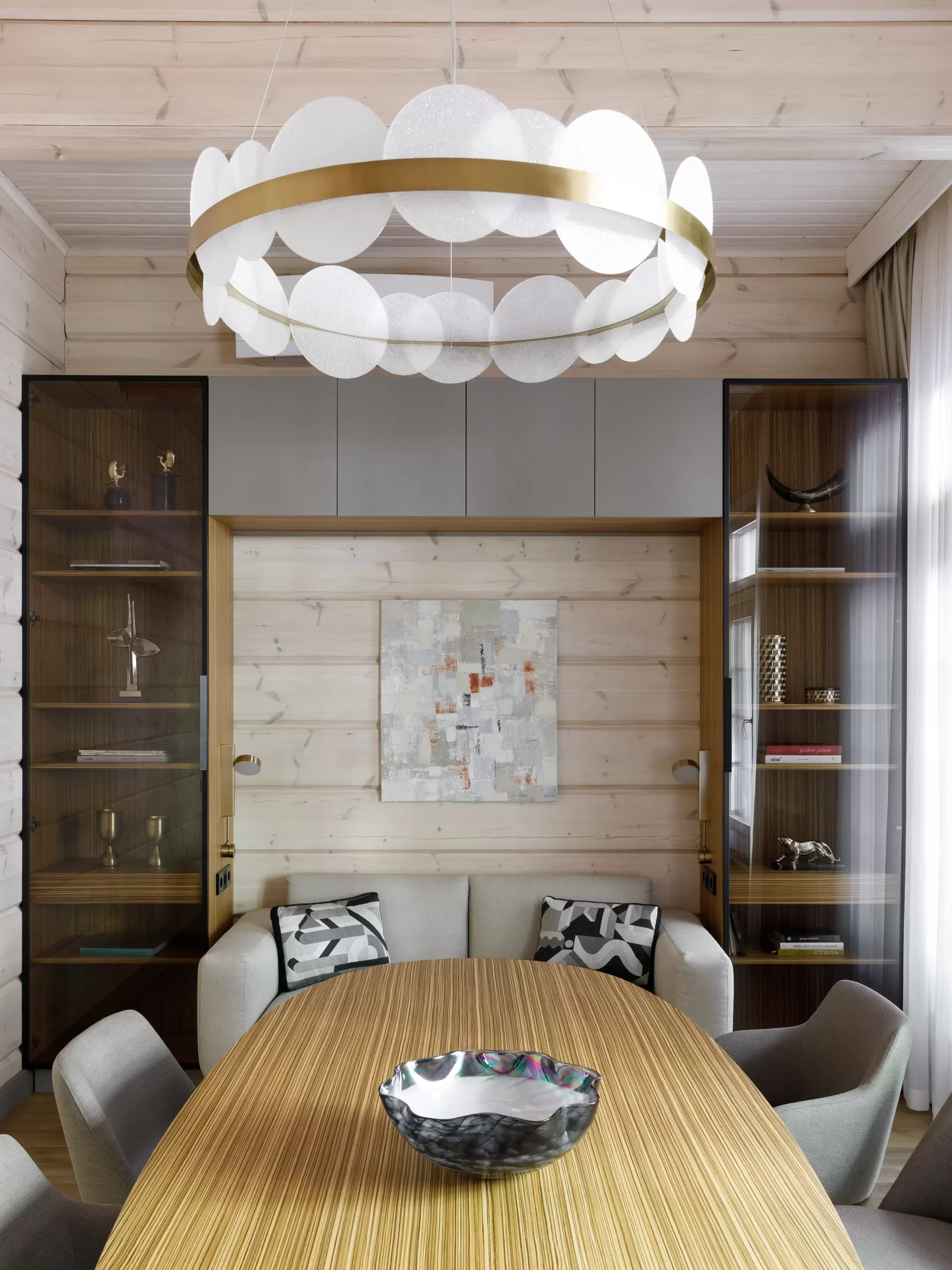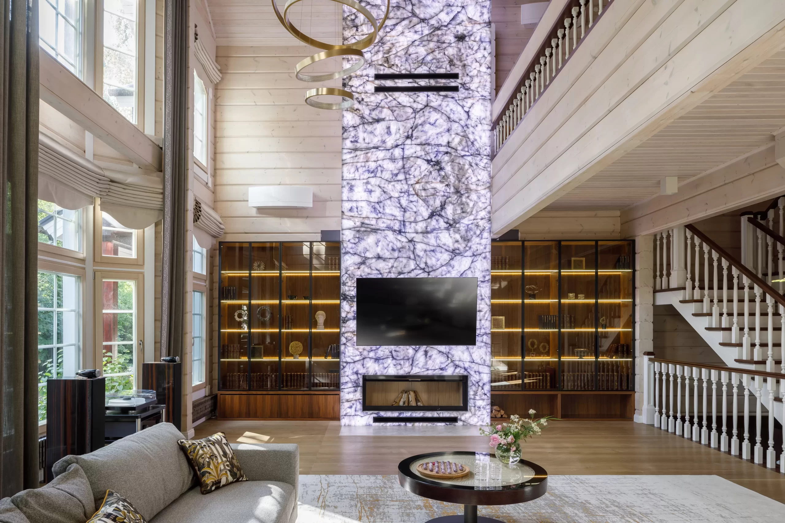 Жемчужиной проекта «Дом в Серебряном бору» — гостиная с камином, облицованным кварцем, с вмонтированной подсветкой.