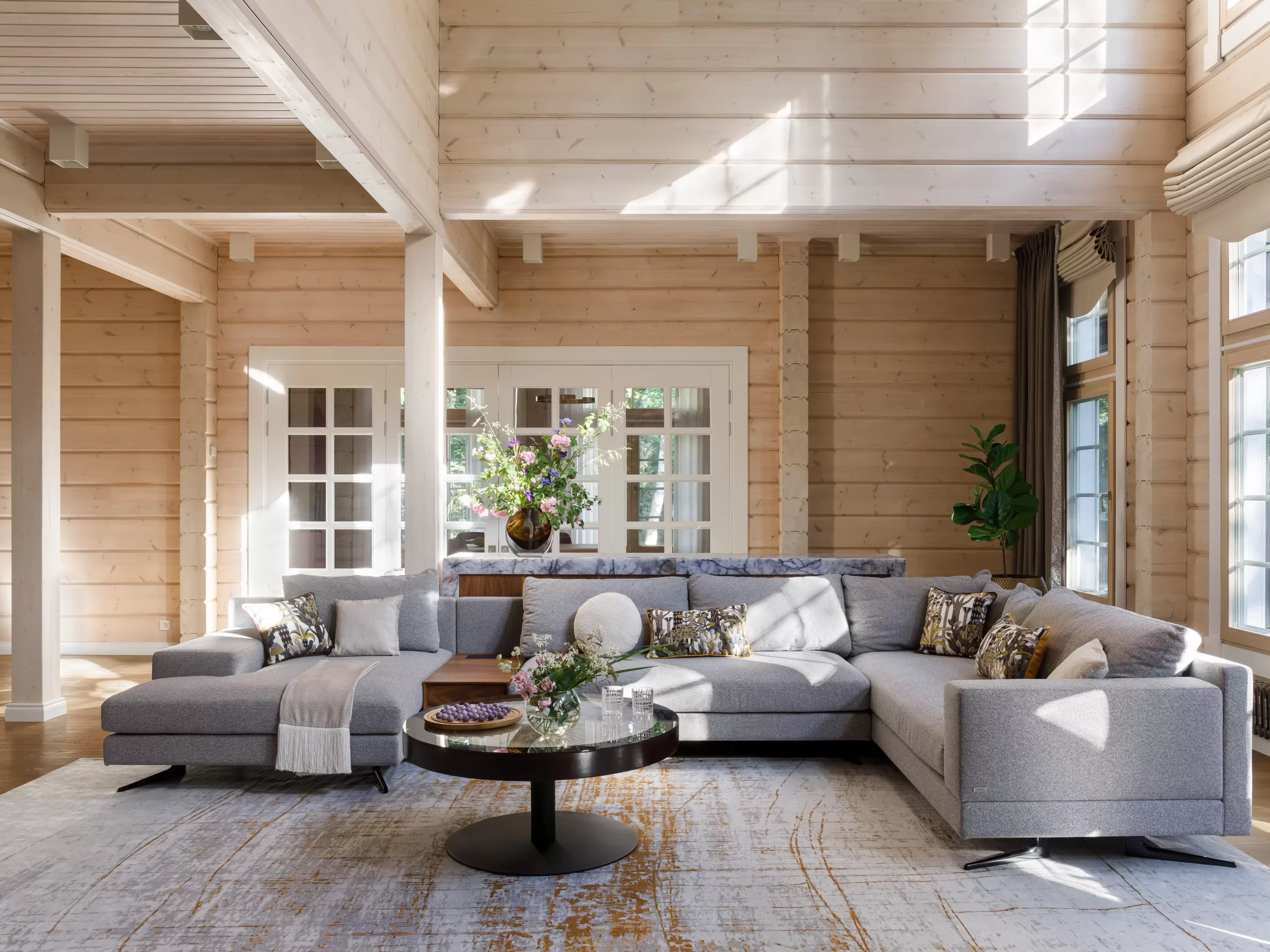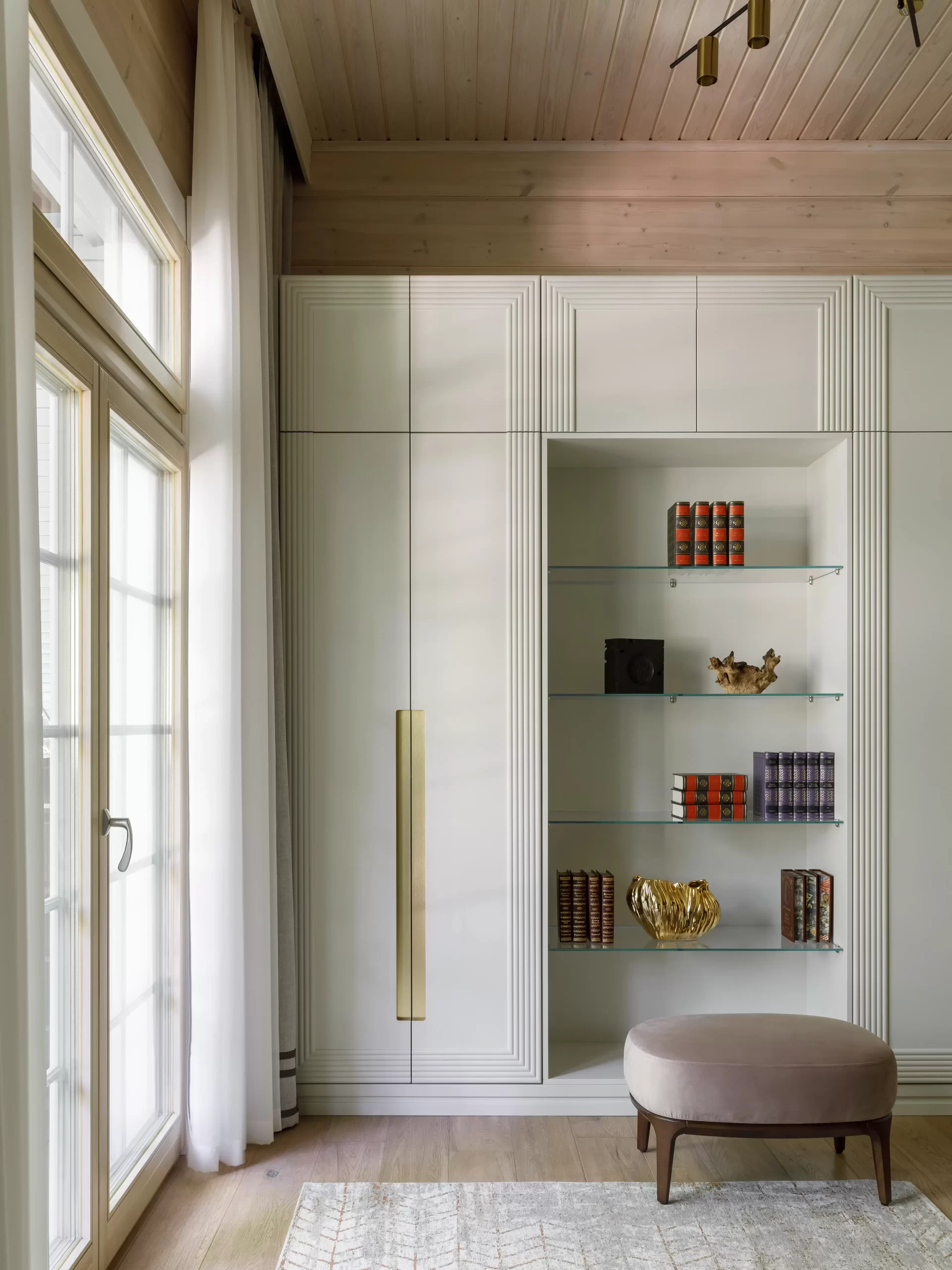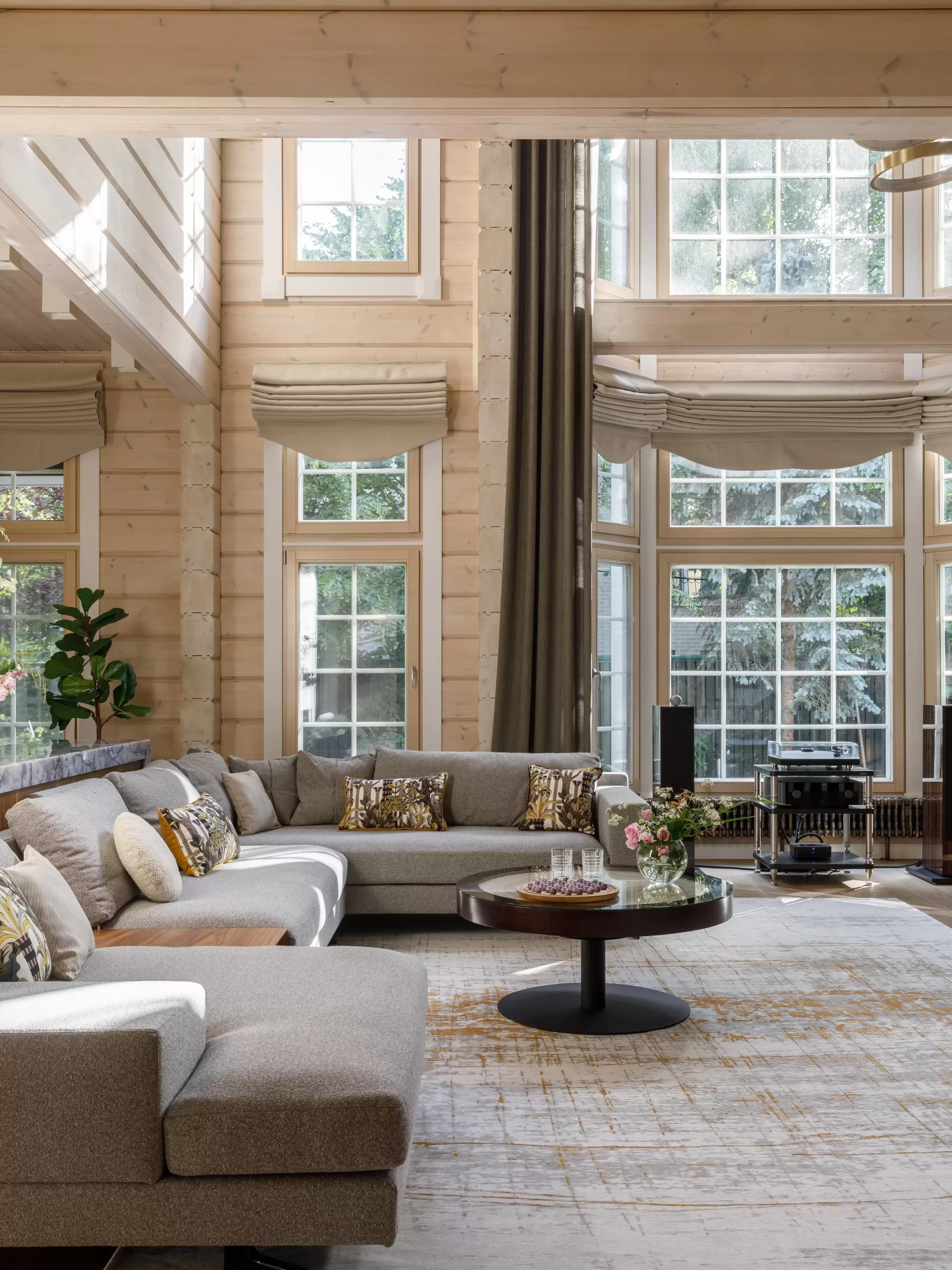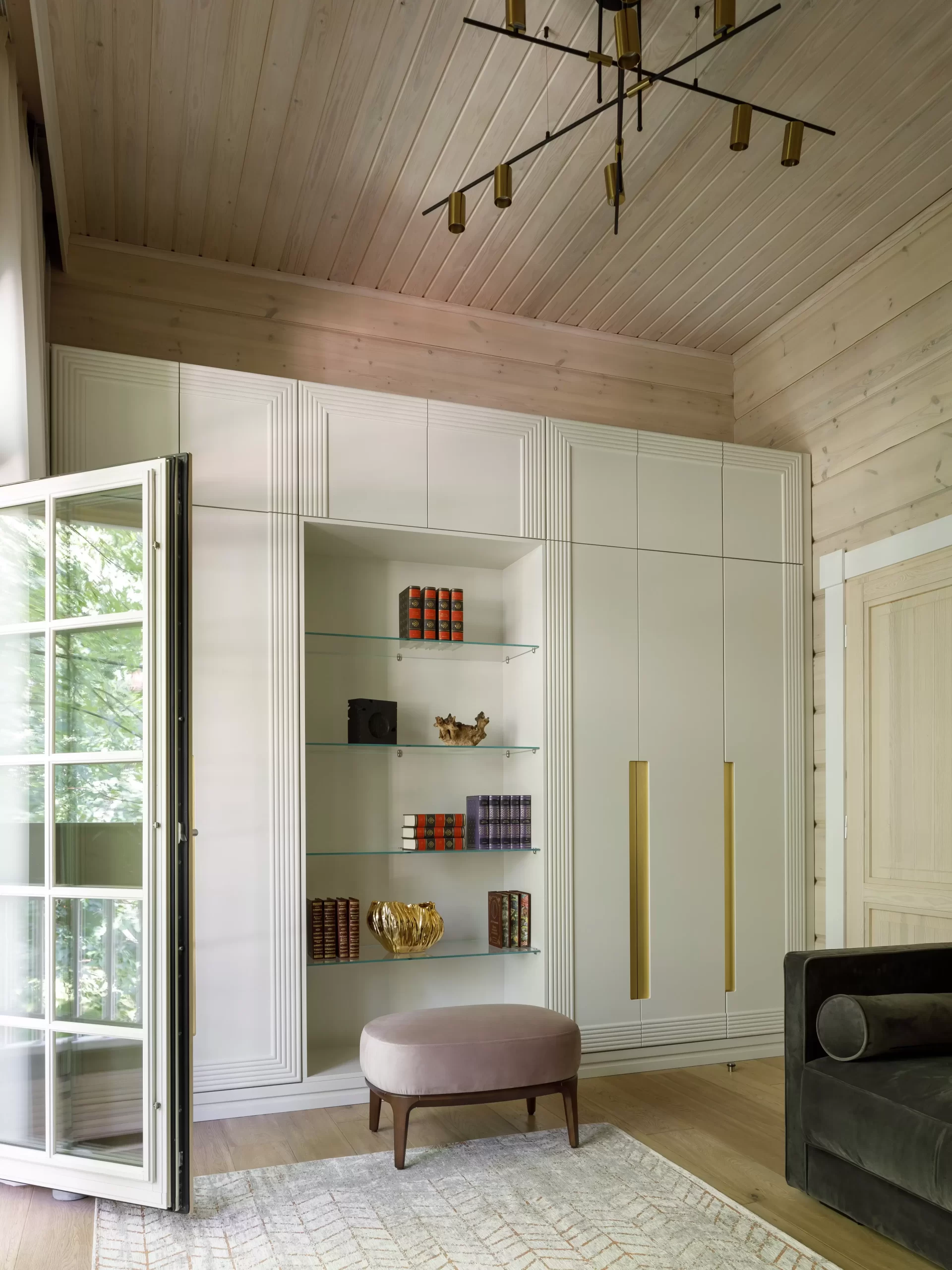 Жемчужиной проекта «Дом в Серебряном бору» — гостиная с камином, облицованным кварцем, с вмонтированной подсветкой.