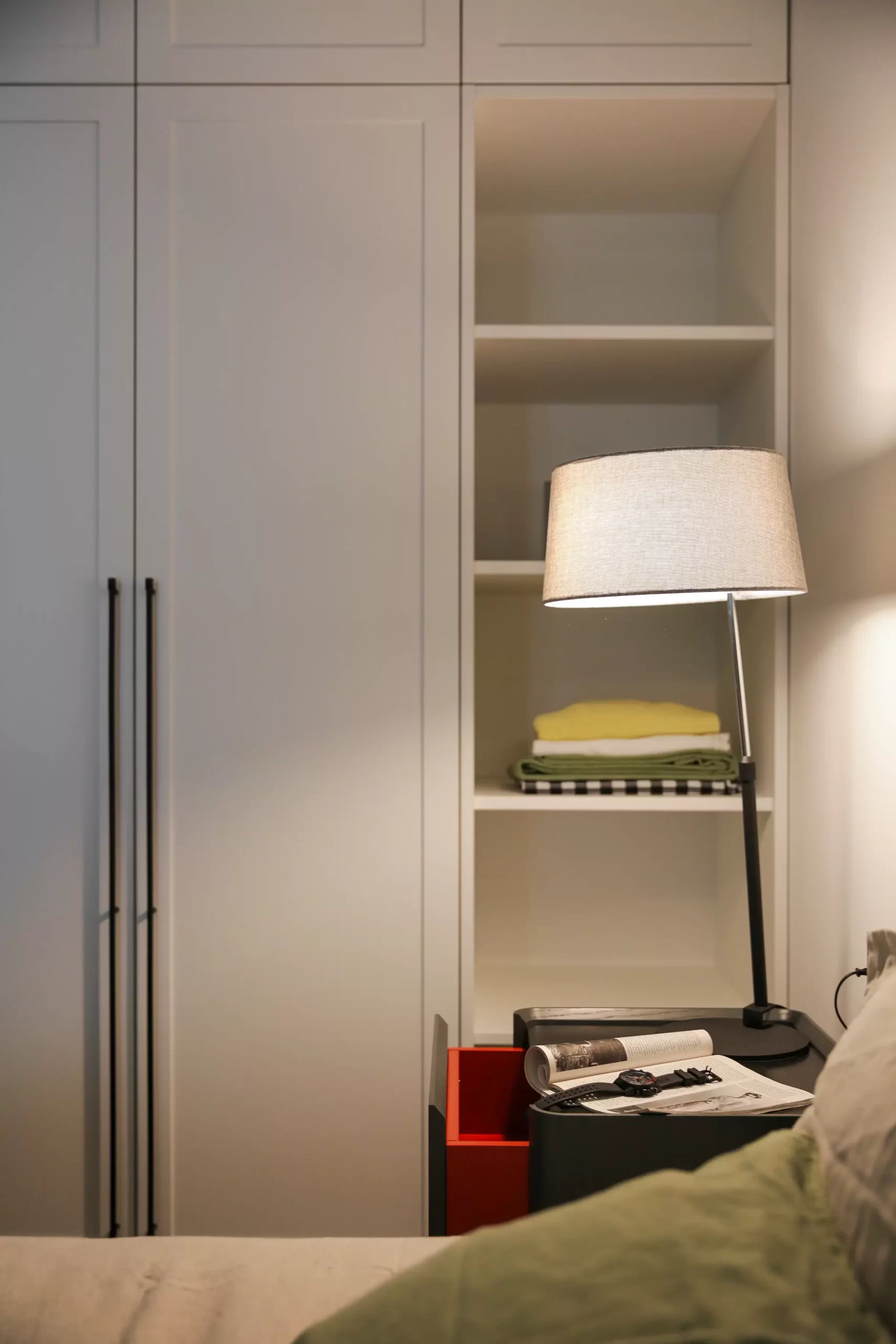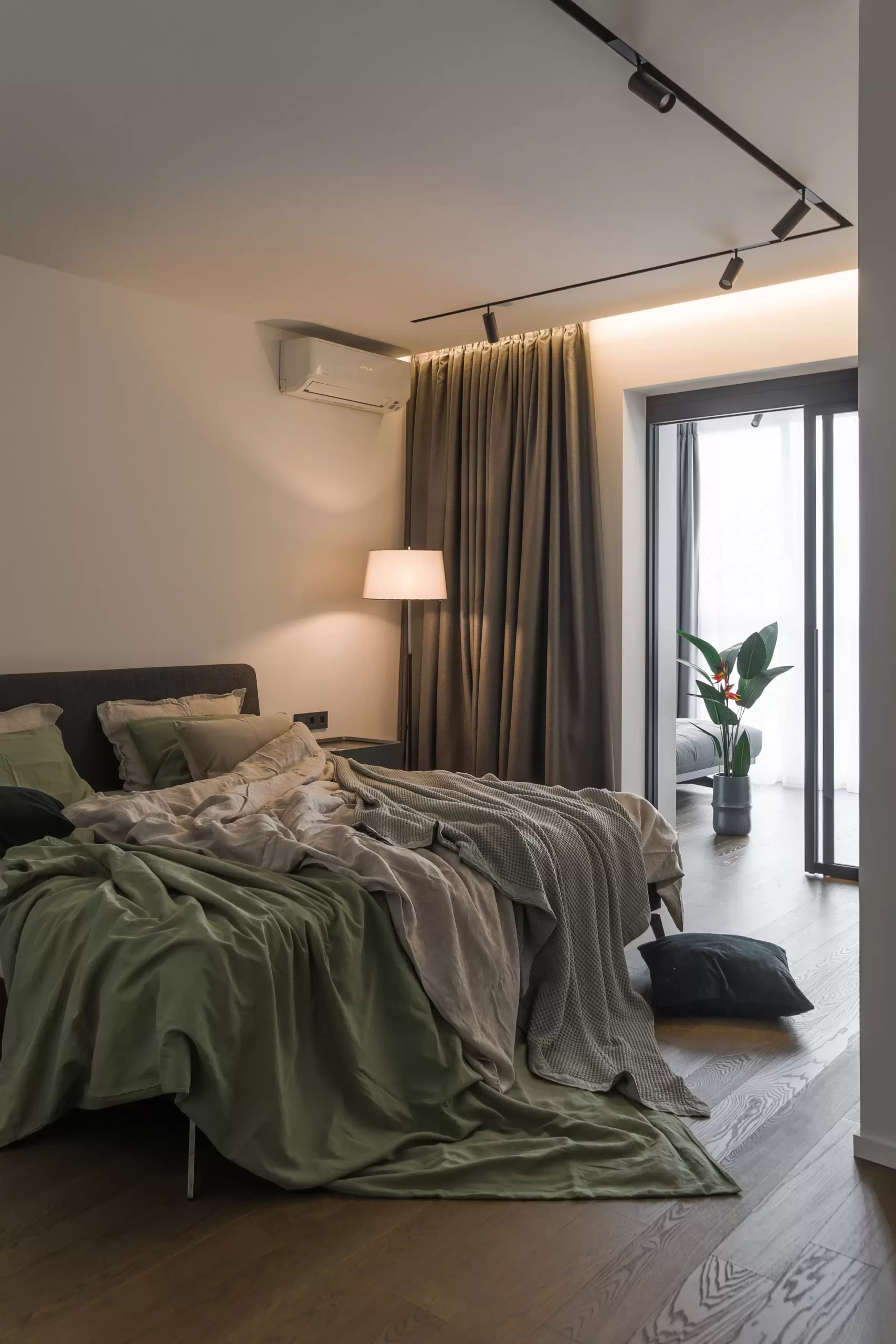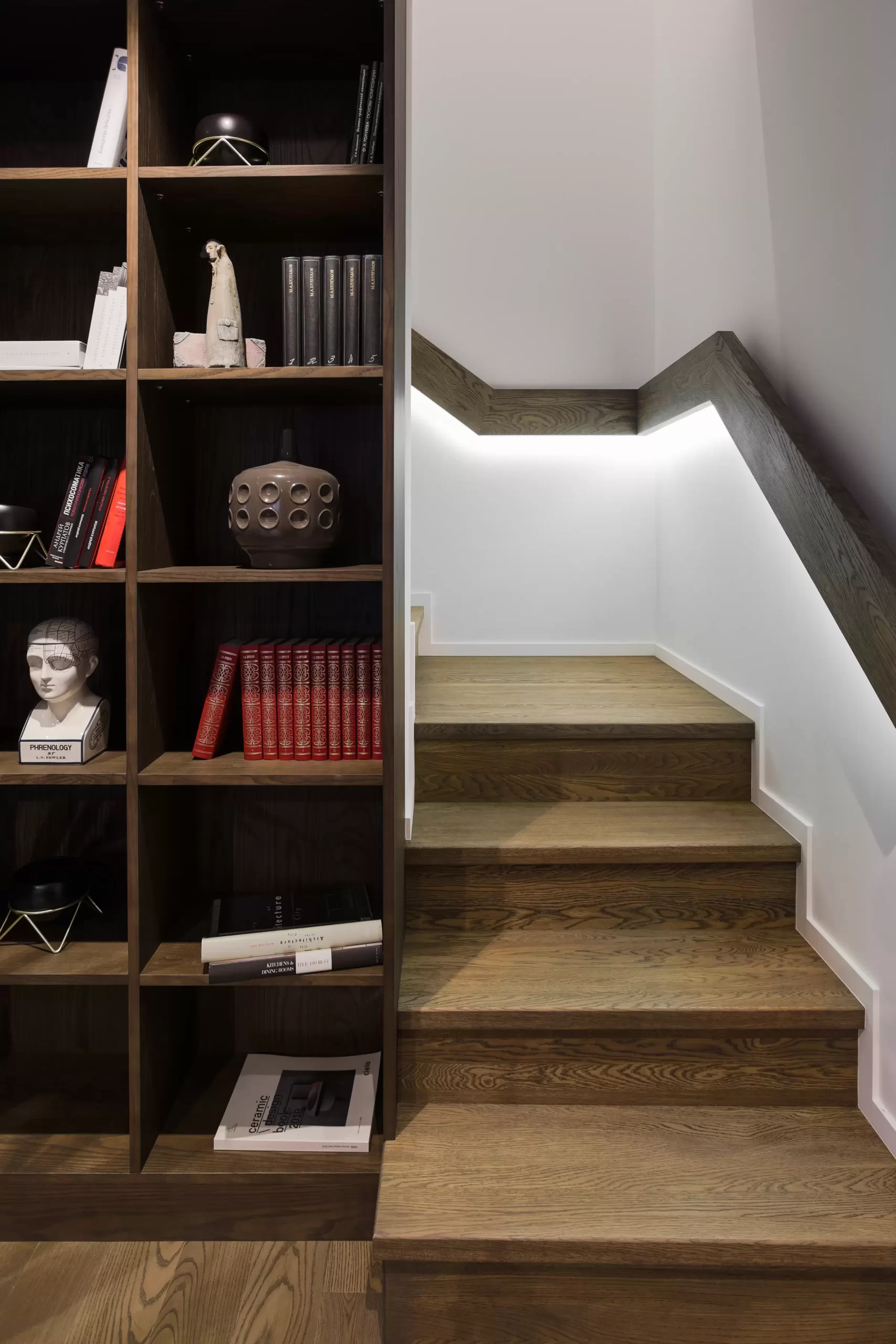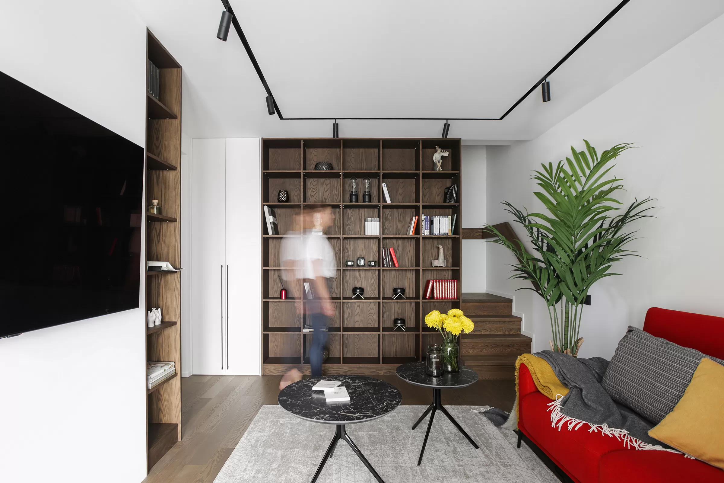 Квартира двухуровневая, на нижнем этаже традиционно расположились помещения для отдыха, развлечений, приема гостей и комната для творчества — это было одно из обязательных условий. Второй этаж приватный, здесь только спальня, санузел и небольшой кабинет в лоджии.