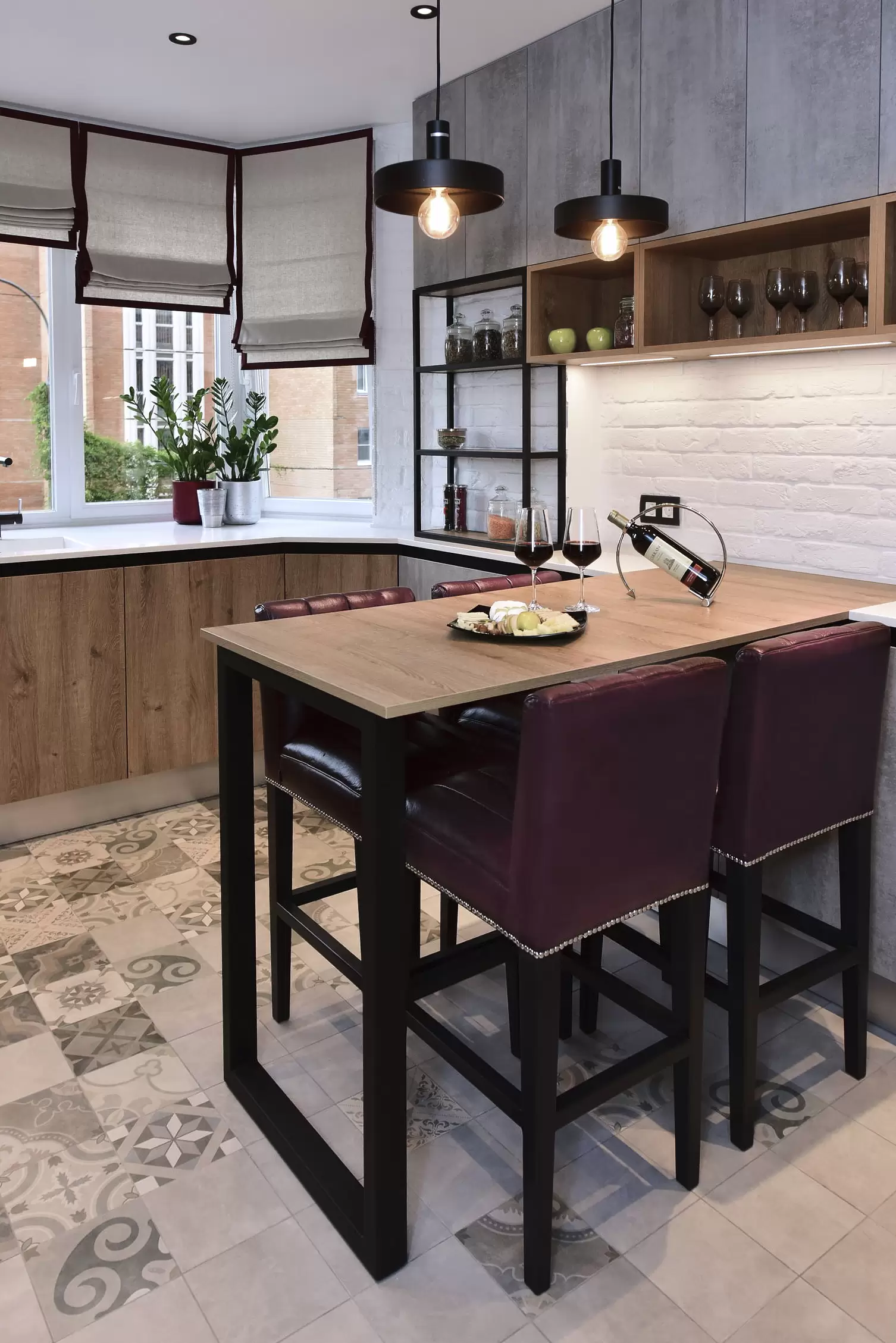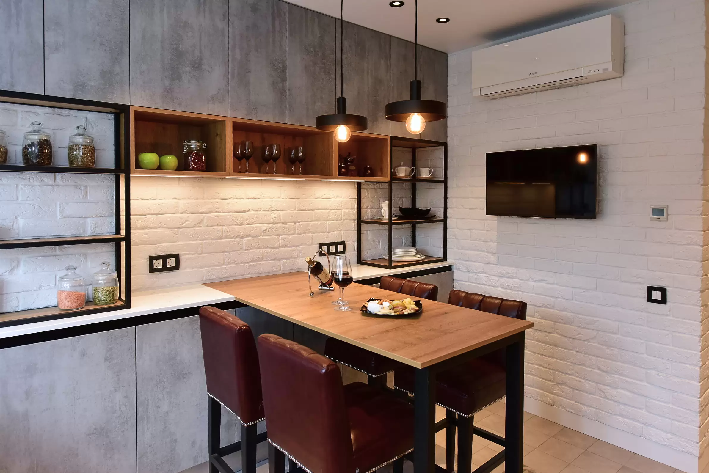 Обеденная зона сочетает в себе компактную и функциональную мебель. Барные стулья Eva с высокой спинкой, стол с деревянной столешницей и металлическим каркасом, открытые стеллажи для хранения.