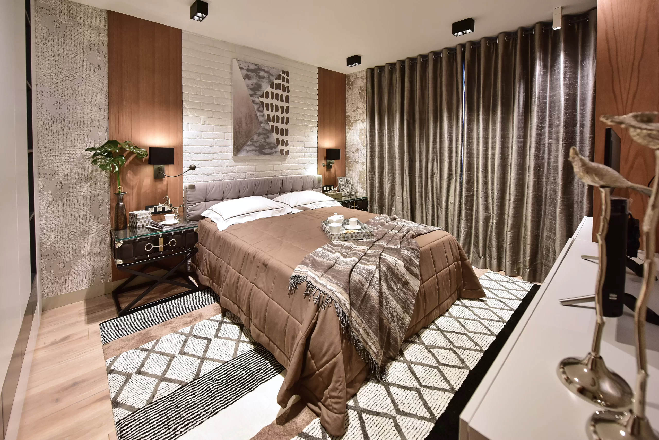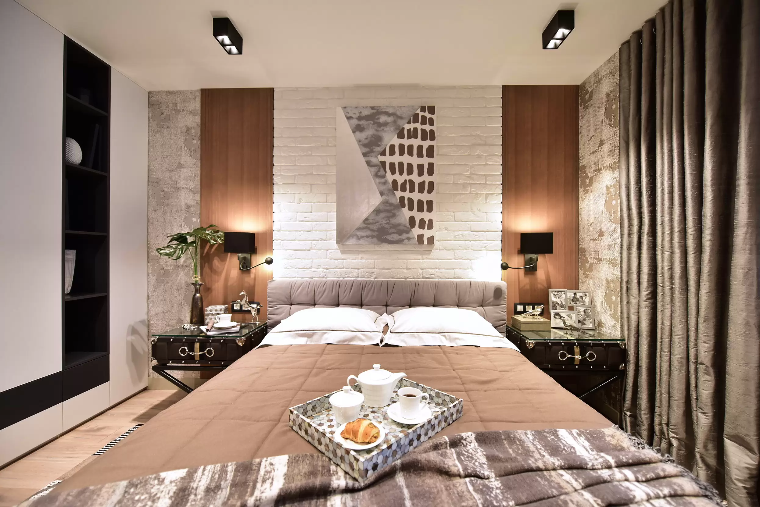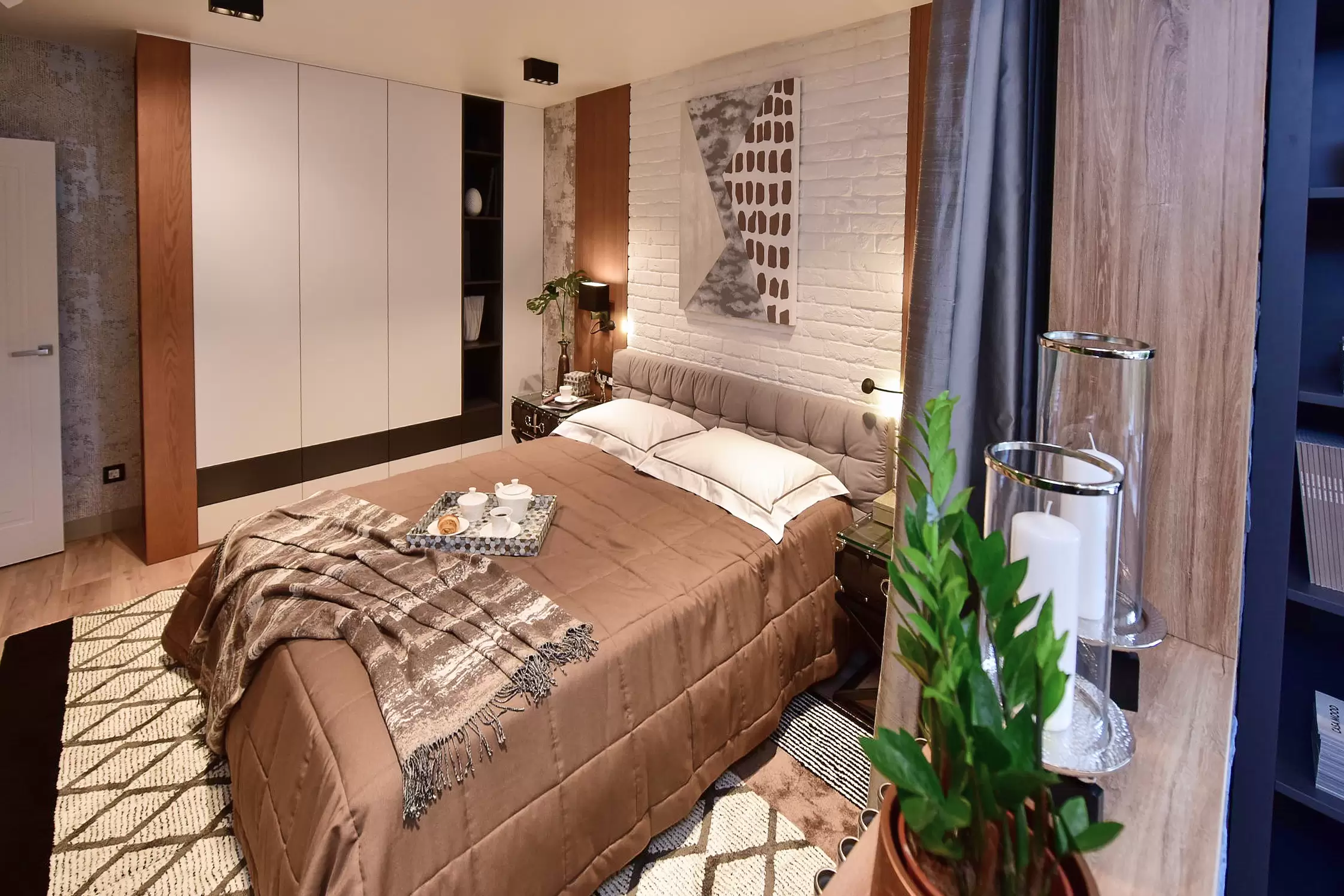 Главным элементом спальни стала кровать Space, особое внимание в которой уделили ткани, чтобы она была с эффектом «собранности».