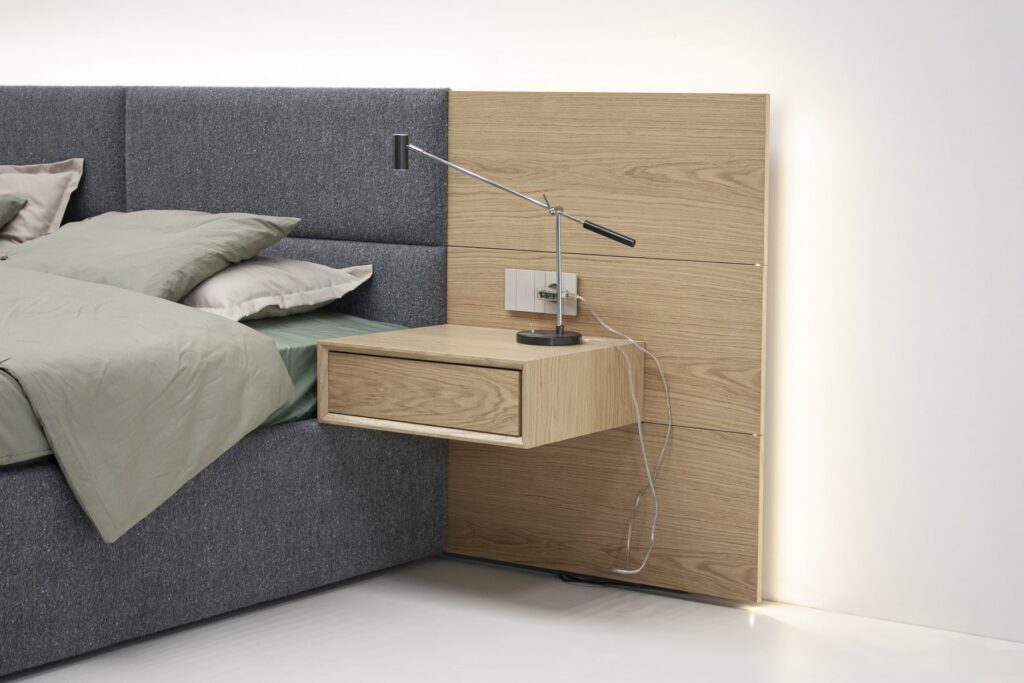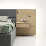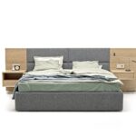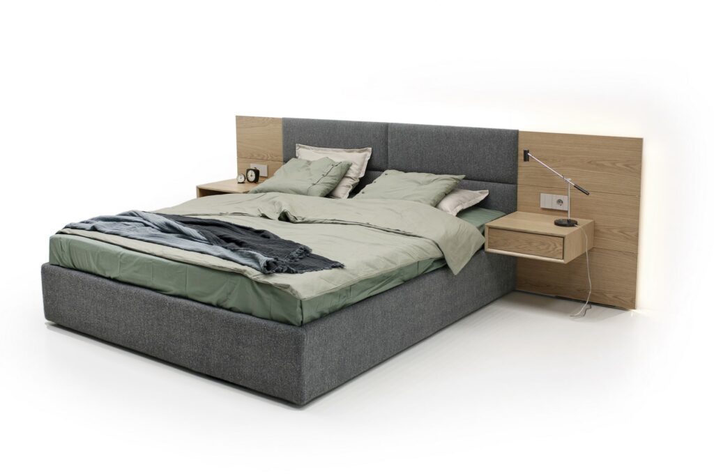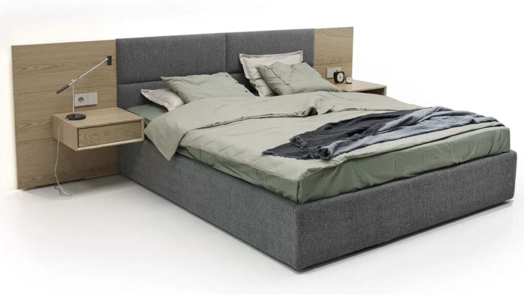 Конструкция включает панели из различных материалов, которые можно комбинировать для достижения нужного акцента и гармонии в пространстве. Подвесные тумбы добавляют легкости, создавая ощущение невесомости и визуального простора. Встроенная подсветка служит финальным штрихом, подчеркивая фактурность и уникальность кровати, добавляя особую атмосферу в зону отдыха.