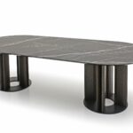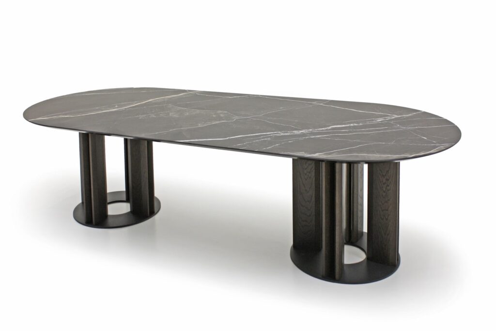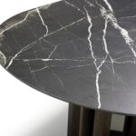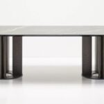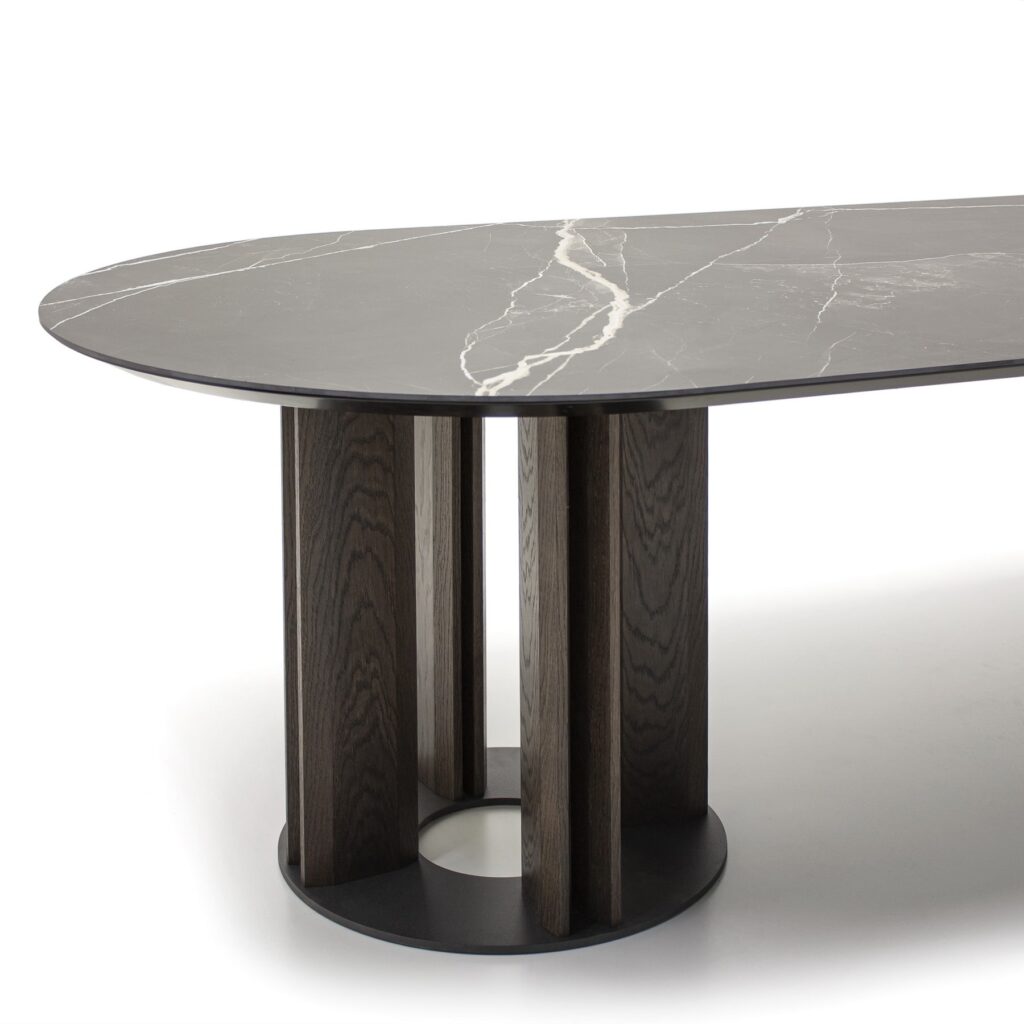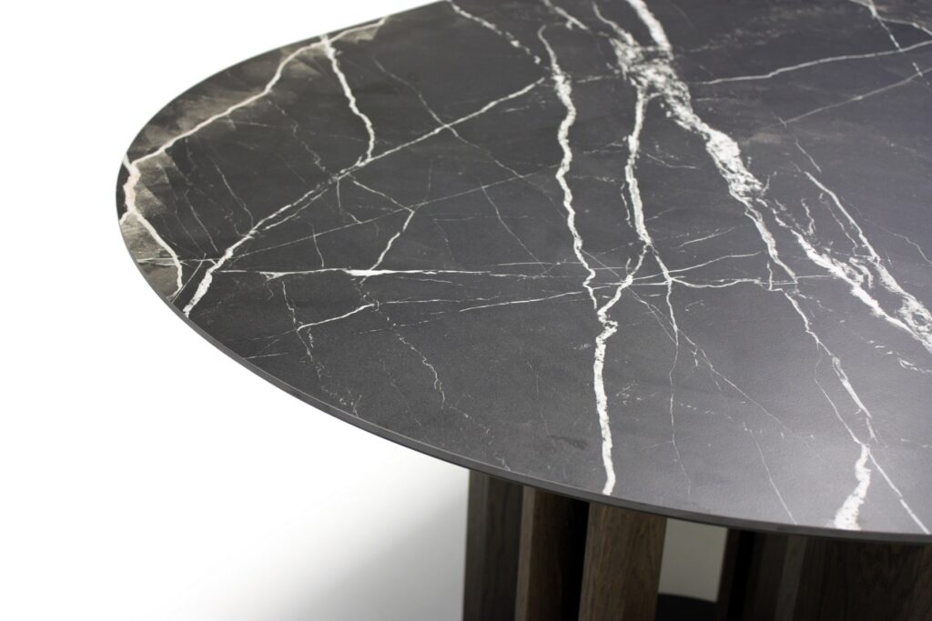 Конструкция стола продумана до мельчайших деталей: лопасти стоек сгруппированы парами и расположены по кругу на массивном 10-миллиметровом кольце-пьедестале, обеспечивая устойчивость и визуальную гармонию. Столешница выполнена из высококачественной широкоформатной керамики, что добавляет прочности и элегантности изделию. Для дополнительного удобства можно добавить «ленивую сьюзен» — вращающийся элемент, который обеспечит легкий доступ к блюдам и предметам на столе.