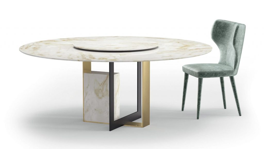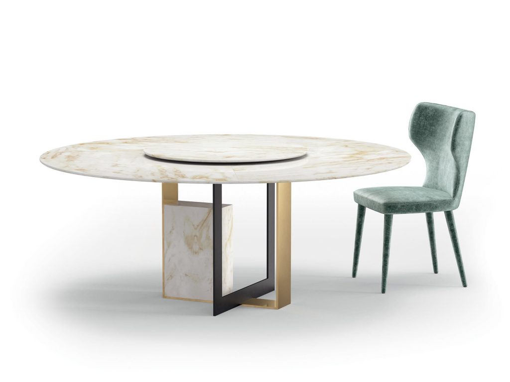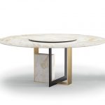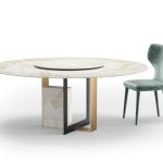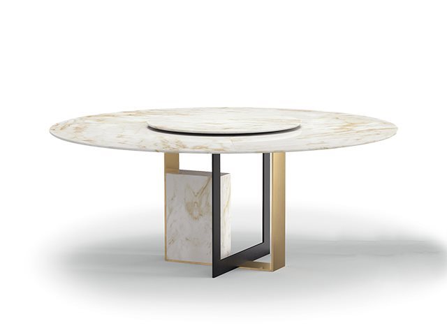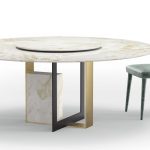 Стол Moore характеризуется исследованием чистой геометрии через необычные объемы, линии и разрезы. Основание спроектировано с тщательным балансом, заданным блокировкой между двумя металлическими пластинами: глянцевой золотой, в которой находится монолитный блок из керамики с эффектом мрамора, и матовой черной рельефной пластиной. Доступный в круглом или прямоугольном варианте.