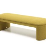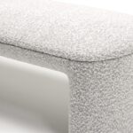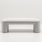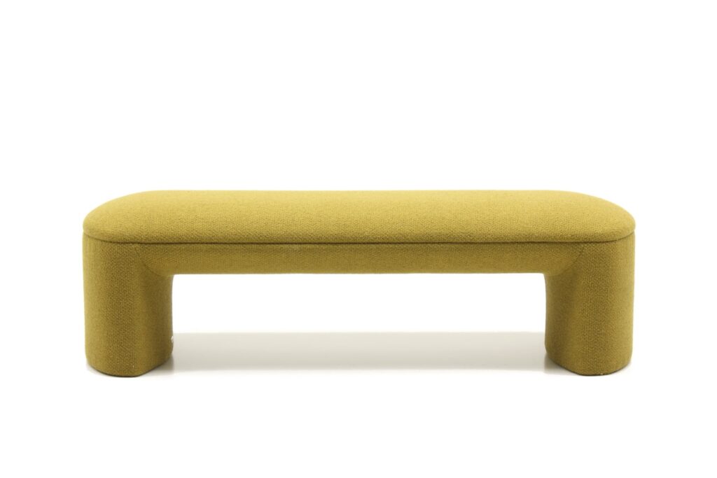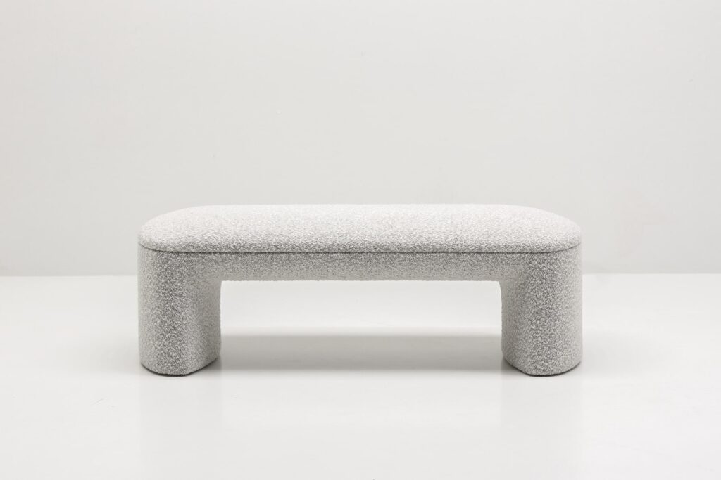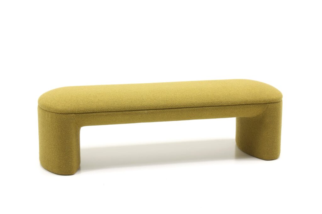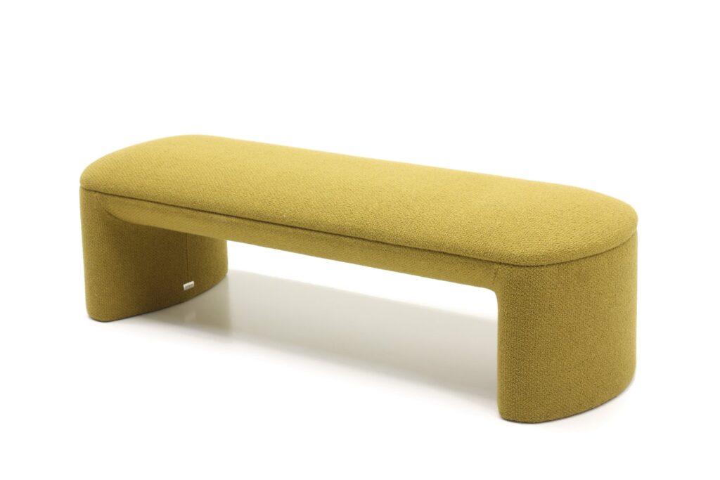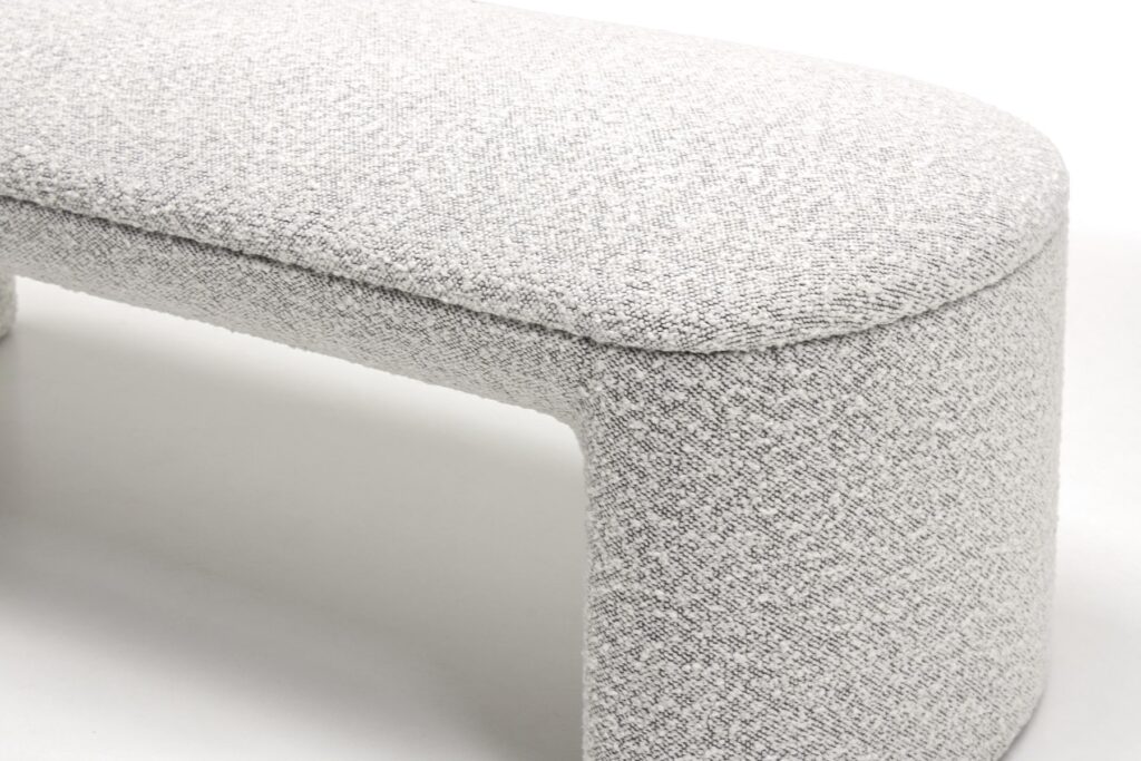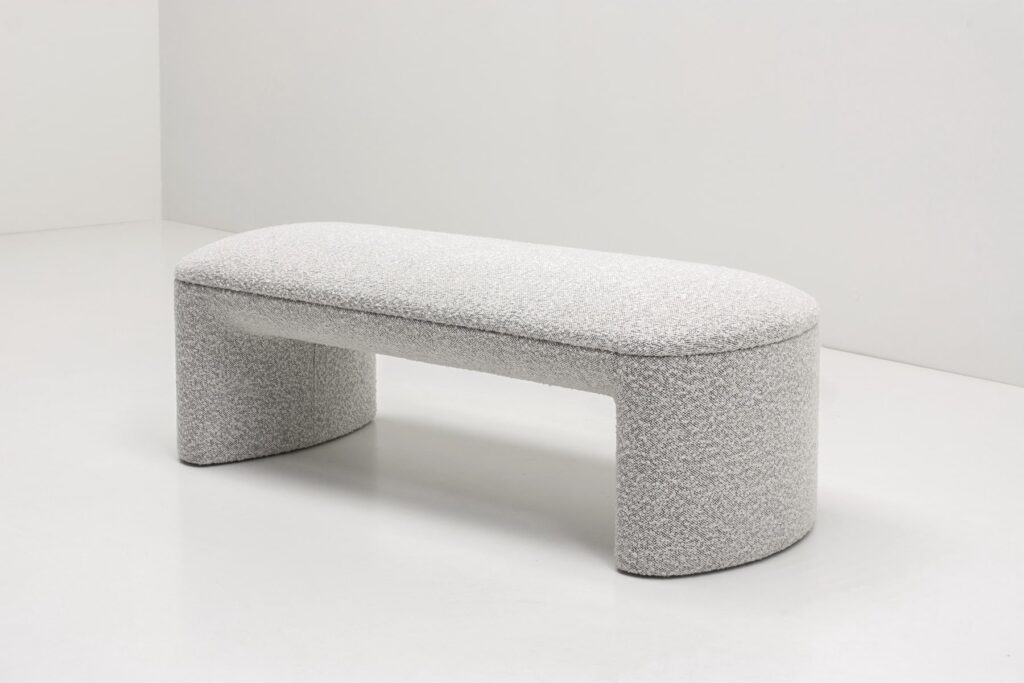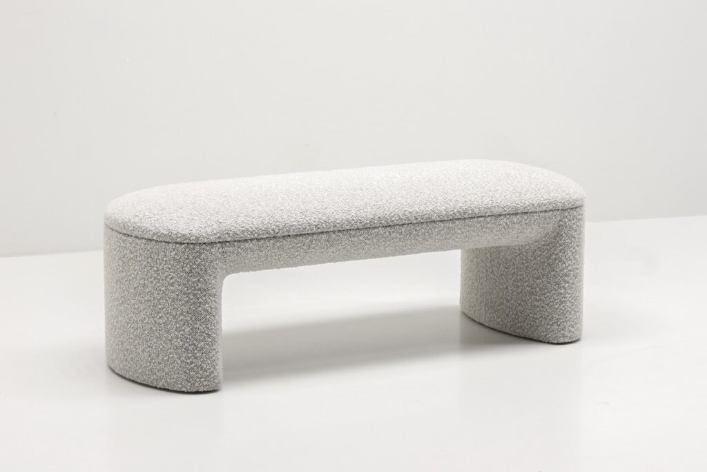 Обтекаемые линии банкетки, идеально скругленные углы и плавные изгибы перекликаются с природными формами, что создает ощущение уюта и домашнего тепла. Массивное основание, полностью обтянутое обивкой, придает легкость визуальному восприятию.
