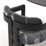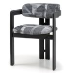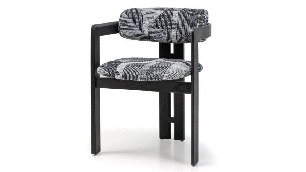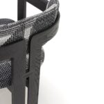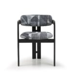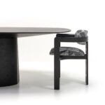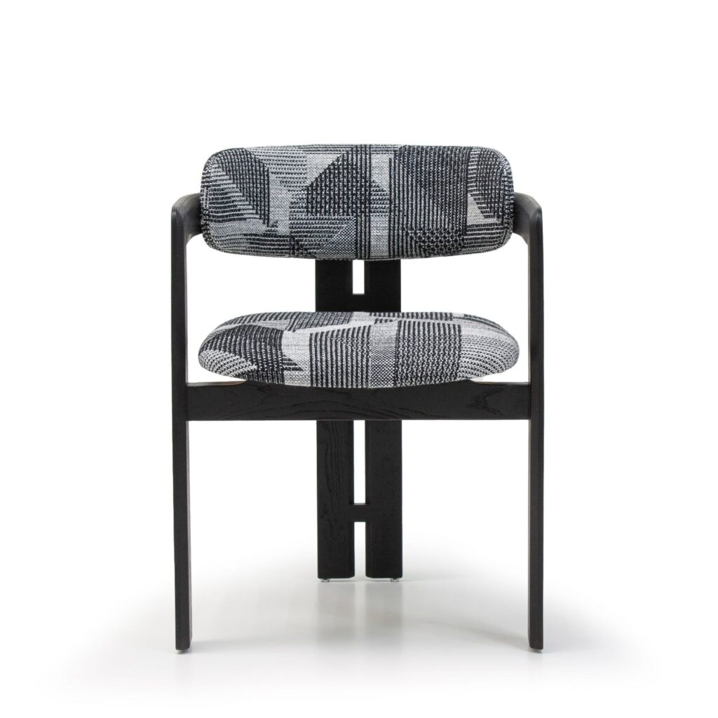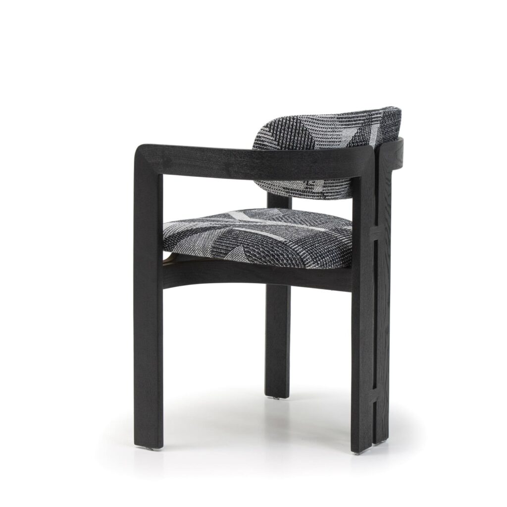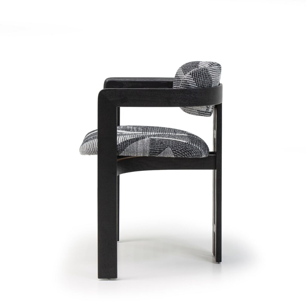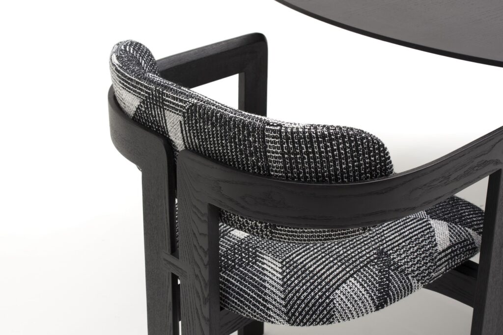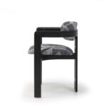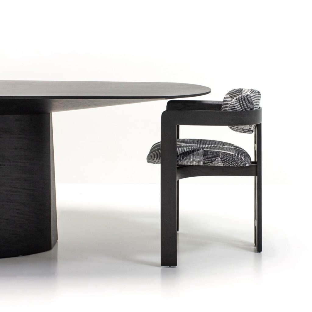 Основа стула — его элегантный каркас из ясеня с глубокой тонировкой «черный уголь» демонстрирует благородную текстуру натурального дерева. Главный конструктивный элемент – широкая задняя опора с вертикальными прорезями. Это не просто декоративный прием — это игра с массой и пространством, светом и тенью, которая делает конструкцию визуально проницаемой и динамичной. Монолитная форма подлокотников подчеркивает целостность и основательность всей структуры.