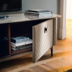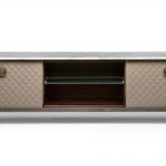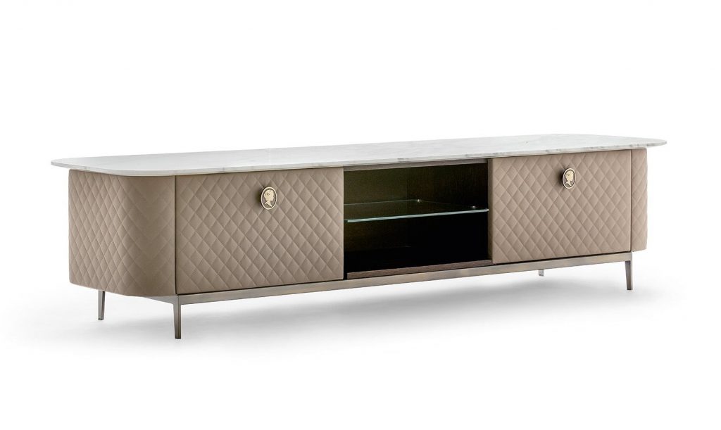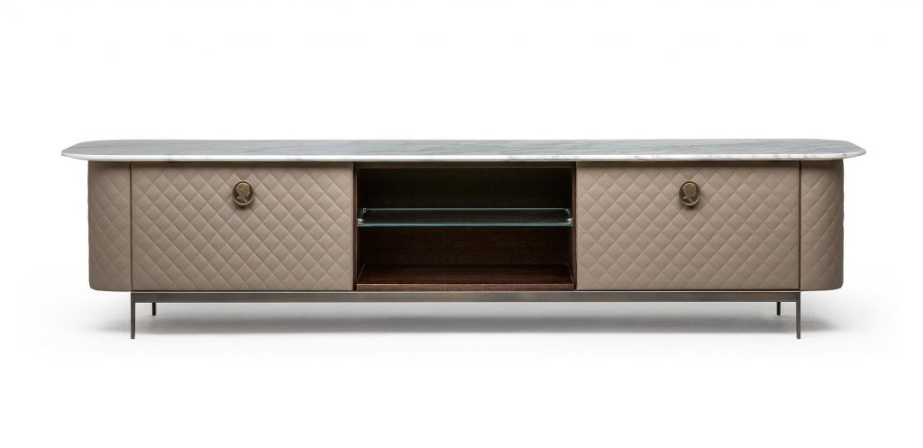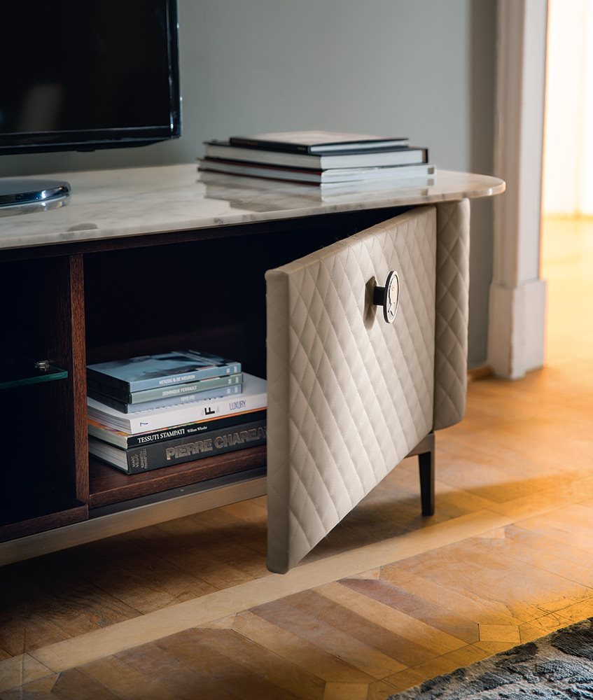 Двери и ящики покрыты кожей выстеганной диамантом, для того чтобы придать всему ряду шикарный вид итальянской haut couture. Роскошное дорогое исполнение для идеального интерьера.
