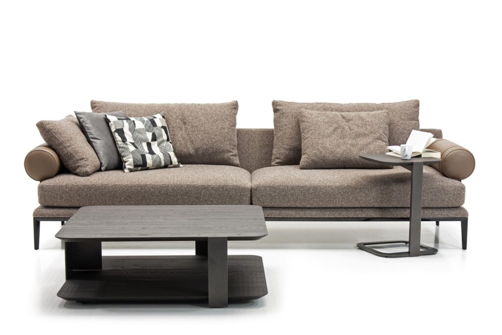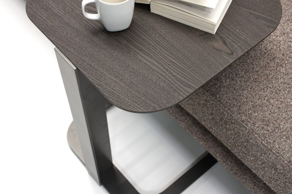 Коллекцию Allure дополняет изящный приставной столик. Его Г-образный силуэт мягко обтекает мебель, предлагая удобную поверхность под рукой именно там, где это необходимо, не загромождая пространство.