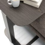 Стол словно парит на двух чётко очерченных ярусах. Этот приём не только добавляет глубины и объёма, но и создаёт функциональную сцену для вашего декора — нижний уровень идеален для книг, а верхний для изысканных аксессуаров или чашечки кофе. Столешницы объединены изящными металлическими элементами, создающими эффект парения, который придаёт столу индустриальный шик и невесомость, контрастируя с теплотой дерева.