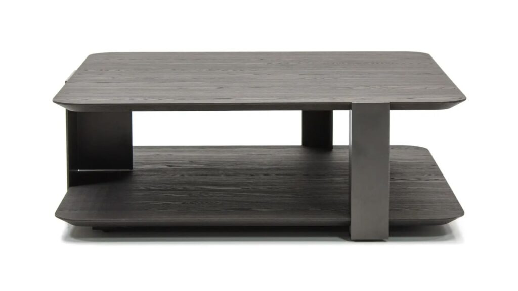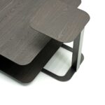 Стол словно парит на двух чётко очерченных ярусах. Этот приём не только добавляет глубины и объёма, но и создаёт функциональную сцену для вашего декора — нижний уровень идеален для книг, а верхний для изысканных аксессуаров или чашечки кофе. Столешницы объединены изящными металлическими элементами, создающими эффект парения, который придаёт столу индустриальный шик и невесомость, контрастируя с теплотой дерева.