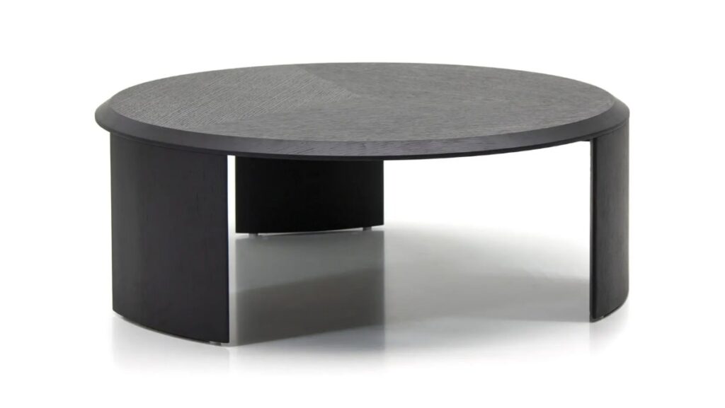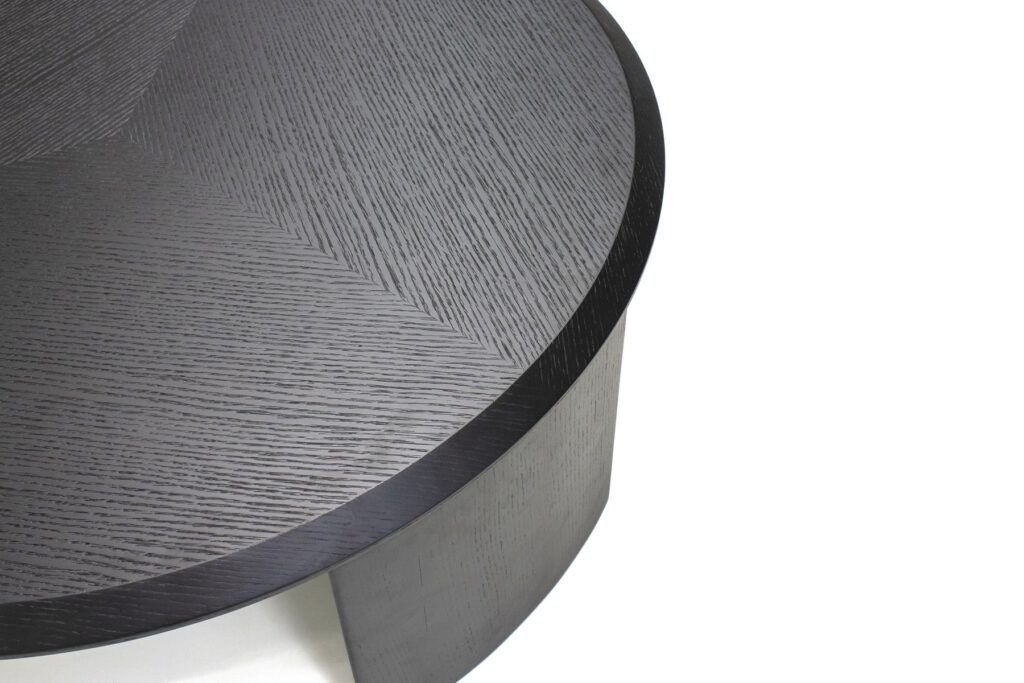 Столешница словно парит на двух плоских опорах, что придаёт столику скульптурный вид и невероятную универсальность. Он легко может занять место у кресла, дивана или даже служить прикроватным столиком.